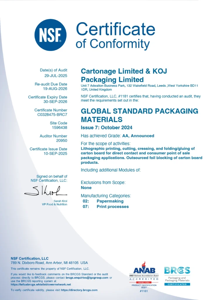 Following a successful BRCGS audit in July 2025, we have been awarded AA grade.